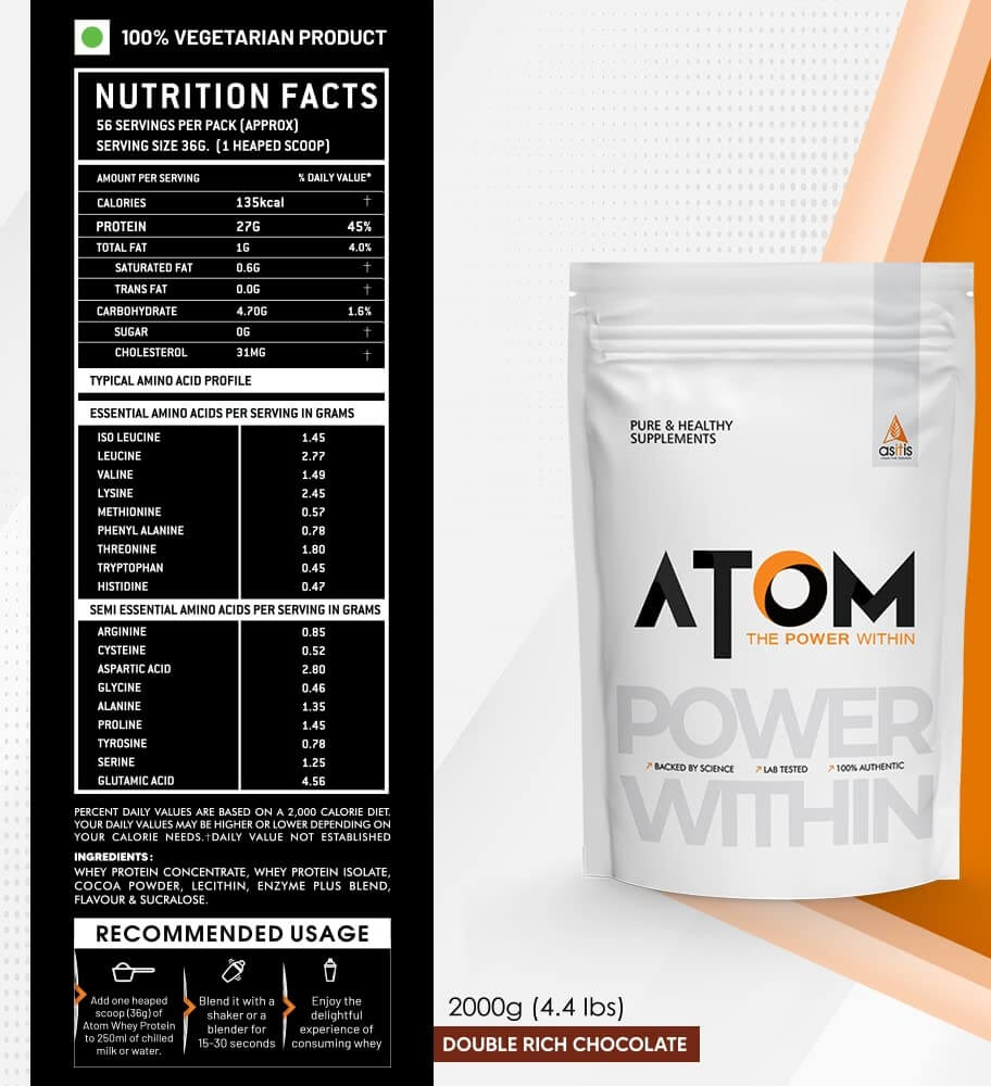 BOOSTS YOUR PERFORMANCE TO NEXT LEVEL: When compared to others, Atom Whey protein has greater bioavailability, solubility, and the highest PDCAA score of 1. The high-quality protein offers 27g protein per serving, 5.7g BCAA, 4.5g glutamine with minimal calories, fat, and no sugar. Whether you engage in aerobic or resistance training, Whey protein supplementation helps you get the best out of every workout.