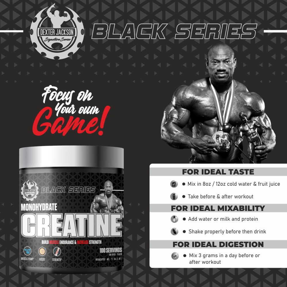 Unlock Peak Performance with Dexter Jackson Black Series Monohydrate Creatine Powder - 300g, 100 Servings. Elevate Your Workouts and Achieve Your Fitness Goals with the Purest Creatine Formula. Boost Strength, Endurance, and Muscle Growth Naturally. Order Now for Enhanced Athletic Performance and Unrivaled Result