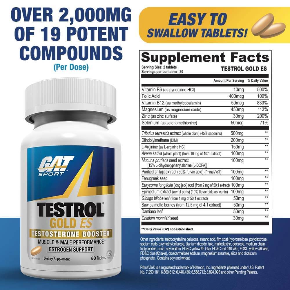 Testrol gold es is gat’s specialty men’s testosterone booster. This advanced formula naturally supports male performance, endurance, strength and testosterone, with the added benefit of hormone regulators.* Contains dim, short for 3,3’– diindolylmethane, a compound from indole-3-carbinol (i3c), a phytonutrient that offers estrogen balance support for men.* Dim supports the activity of specific enzymes that support normal estrogen ratios that optimizes testosterone hormone levels.* Added testosterone boosting: primavie, a high quality, clinically proven, shilajit mineral deposit from the Himalayas. Studied to increase total testosterone, free testosterone and dhea.