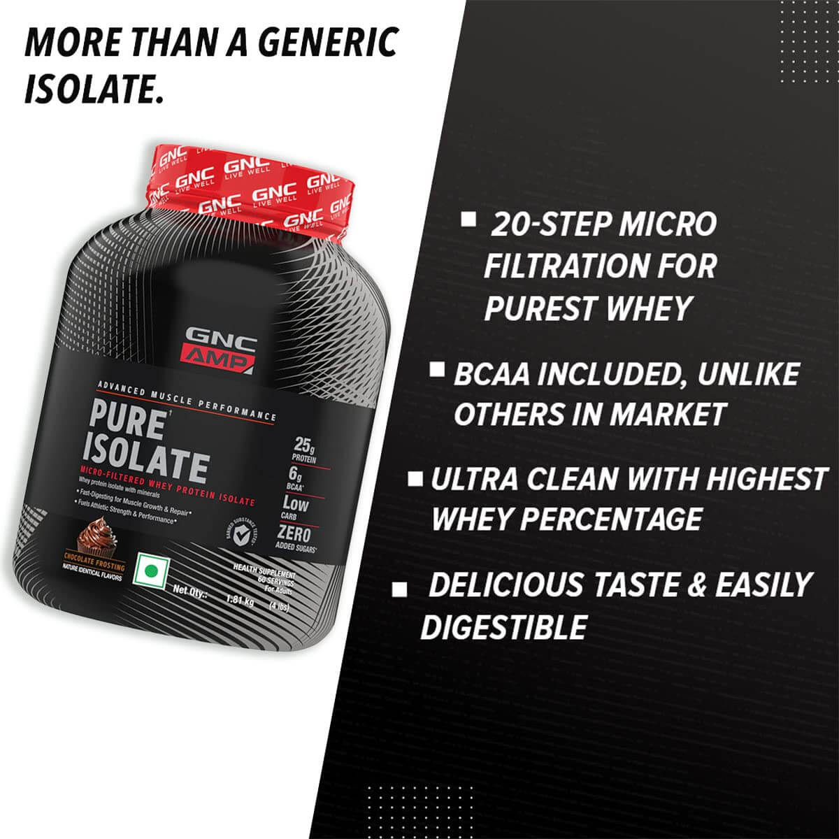 . The all new GNC AMP Pure Isolate 4 Lbs Chocolate Frosting is an advanced formula, which helps to deliver 25g of protein per 32g of serving to help in gaining lean muscle