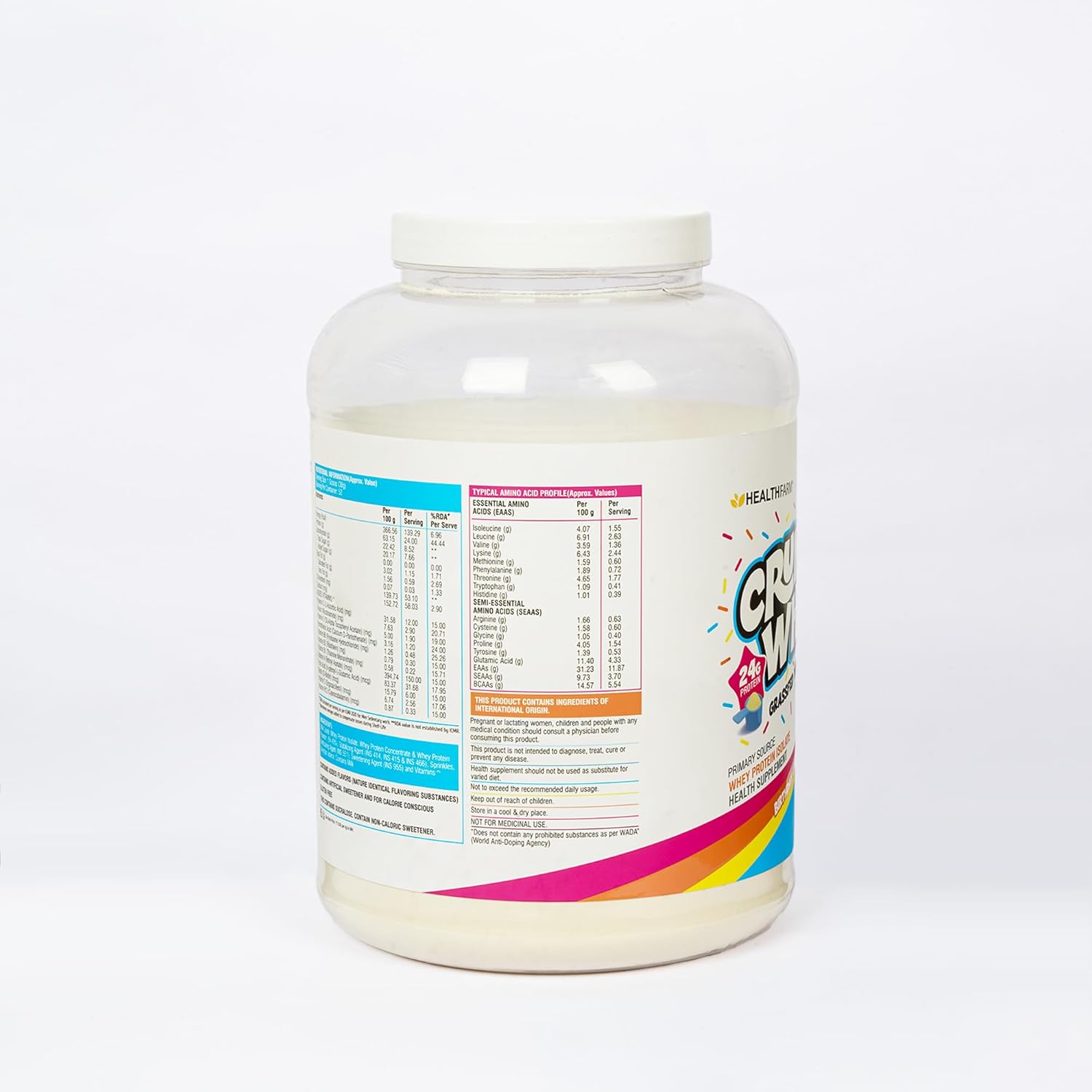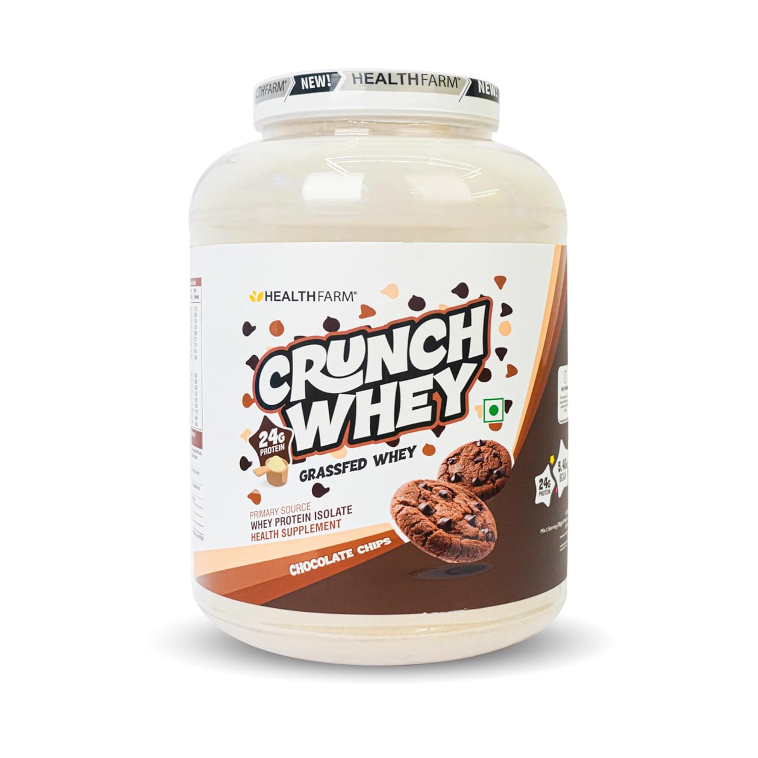 Delicious Flavours with Added Vitamins: Healthfarm Crunch Whey combines functionality with taste, offering two indulgent flavours—Chocolate Chips and Birthday Cake. Beyond the taste, it’s fortified with added vitamins to support your overall wellness, making it not just a protein supplement, but a holistic nutrition partner.