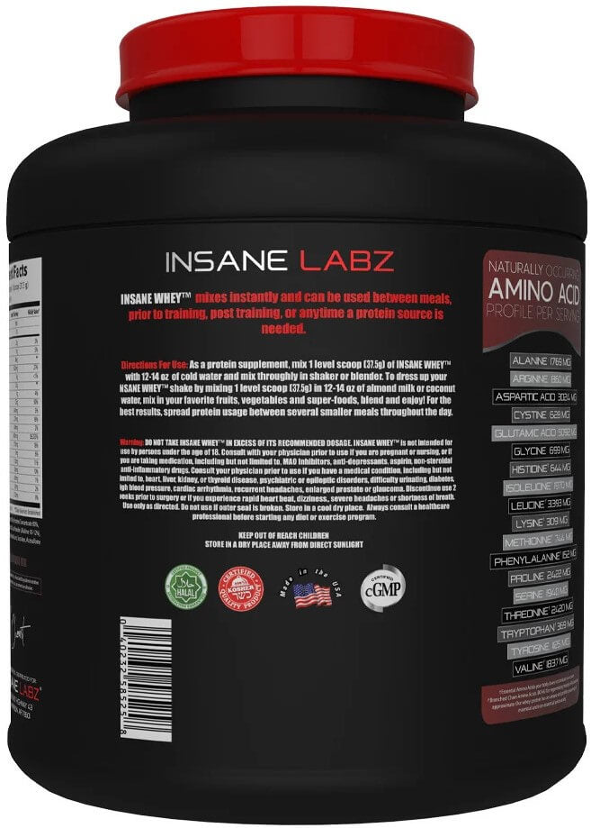 . Insane Labz Insane Whey protein promotes lean muscles gains with a full dose of 25g of protein after your workout has ended. With a naturally occurring BCAA amino profile, Insane Whey will boost your recovery time as well.