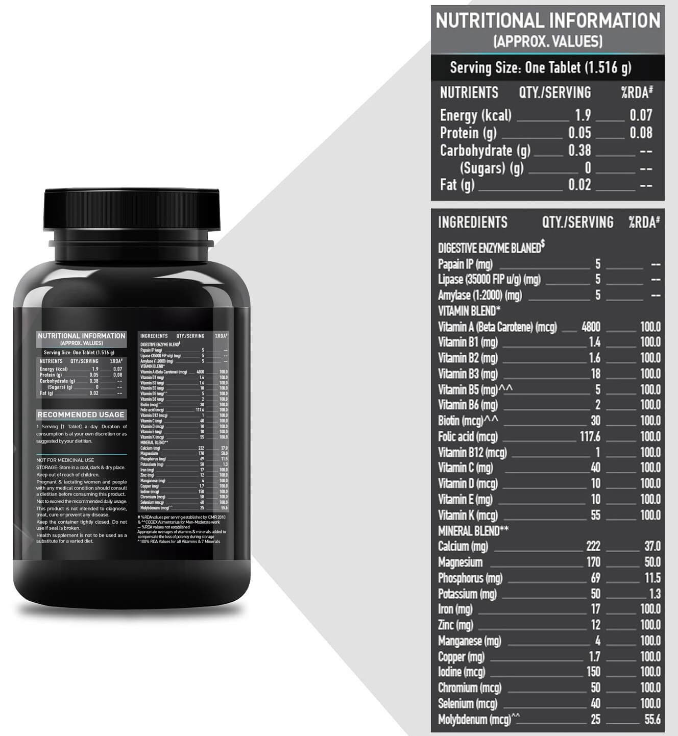 Complete Micronutrient Powerhouse : MuscleBlaze MB-Vite Daily Multivitamin is scientifically formulated with 23 essential vitamins and minerals to fuel your body's vital systems. This comprehensive formula ensures optimal metabolic function and cellular health, delivering the micronutrient foundation needed for peak physical performance and everyday vitality. Trusted by athletes and bodybuilders for It's superior nutritional profile designed specifically for active lifestyles. Enhanced Energy & Performance System : Experience sustained energy and improved stamina with this precision-balanced micronutrient complex. MB-Vite's specialized formula combats fatigue at the cellular level, allowing you to push through intense workouts and demanding days with greater endurance. The synergistic blend works to optimize energy production pathways, giving you the power to perform at your best consistently. Advanced Antioxidant Defense Matrix : Fortified with four key antioxidants Ginkgo Biloba, Grapeseed, Ginseng, and Lycopene MB-Vite provides comprehensive protection against exercise-induced oxidative stress. This powerful combination neutralizes free radicals, reduces muscle fatigue, and enhances recovery, allowing you to train harder while supporting long-term cellular health and performance potential. Comprehensive Immune Fortress : MB-Vite delivers a strategic blend of immune-boosting nutrients including Vitamins A, B6, C, D, E, plus essential minerals like Zinc, Iron, and Folic Acid. This robust formulation strengthens your body's natural defense systems, creating a protective shield against common infections and illness. Maintain training consistency and overall health with this complete immune support complex. Premium Quality Assurance : Each MB-Vite capsule is crafted from pharmaceutical-grade raw materials in HACCP & FSSAI certified facilities under stringent quality control standards. This meticulous manufacturing process ensures maximum potency, purity, and effectiveness in every dose. Designed for optimal absorption with precise nutrient ratios for maximum bioavailability and nutritional impact.