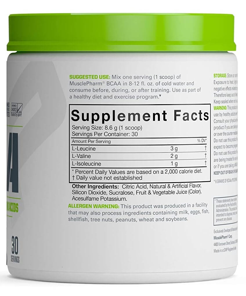 Muscle Pharm - Bcaa Optimized Branched-Chain Amino Acids Powder 30 Servings Fruit Punch - 258 Grams (0.57 Lbs.)Musclepharm Bcaa 3:1:2 Offers A Unique Patent-Pending Ratio, 3 Leucine, 1 Isoleucine, 2 Valine, That Is Specifically Tuned To Deliver The Ideal Amounts Of These Three Amino Acids During All Phases Of Muscle Development And Maintenance. Through This Formulation, Amino Acids Are Released Both Before And After A Workout. Mp Bcaa Minimizes Muscle Damage, While Supporting Increased Lean Body Mass. Musclepharm Bcaa Key Features: Supports Lean Mass Growth Reduces Muscle Breakdown Increases Protein Synthesis Your Body Is Talking - Musclepharm Is Listening It's No Secret That Nutrition And Sports Performance Are Intrinsically Connected. Research Has Proven That Our Bodies Require The Proper Ratio Of Macronutrients (Carbohydrates, Proteins And Fats) To Micronutrients (Vitamins, Minerals), In Order To Perform And Recover From Strenuous Activity. Equally As Important To What Goes In Musclepharm' S Products Is How They Formulate, Evaluate And Refine Them: Unparalleled Science, Research And Real-Life Testing That Proves The Integrity, Effectiveness And Results Of Musclepharm Beyond Any Other Products On The Market. Every Musclepharm Product Is A Direct Result Of A Scientifically Advanced 6-Stage Research And Testing Protocol. They Believe That The Combination Of Proven Science And Real-World Testing In Their State-Of-The-Art Performance Facility Is What Stands Musclepharm Apart From The Competition. They Know The Playing Field Is Competitive - Both Theirs And Yours. And They Know That Sometimes It Just Takes One-Tenth Of A Second, One Goal Or One Product That's Slightly Better Than The Next To Make All The Difference In The World. Musclepharm Believes In It They Use It Science Proves It musclepharm Has Compiled A Team Of Some Of The World's Most Impressive And Respected Medical Doctors, Chemists, Researchers, Nutritionists, Practitioners And Professional At.
