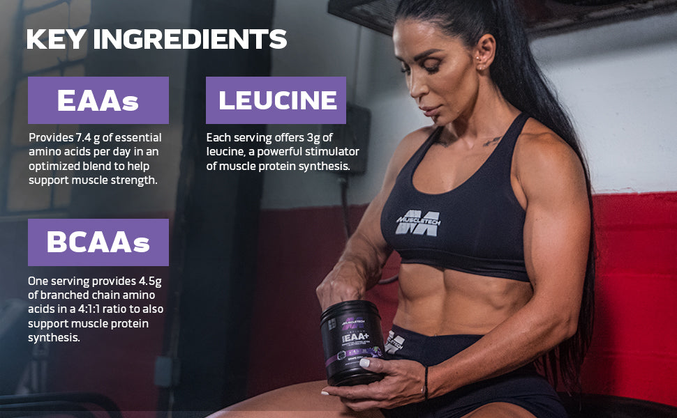 Muscletech™ EAA+ Energy was formulated based on research conducted at a leading university. The formula delivers a unique ratio of essential amino acids (EAAs) to support muscle protein synthesis, strength development and recovery. Additionally, each serving provides key electrolytes to support hydration.