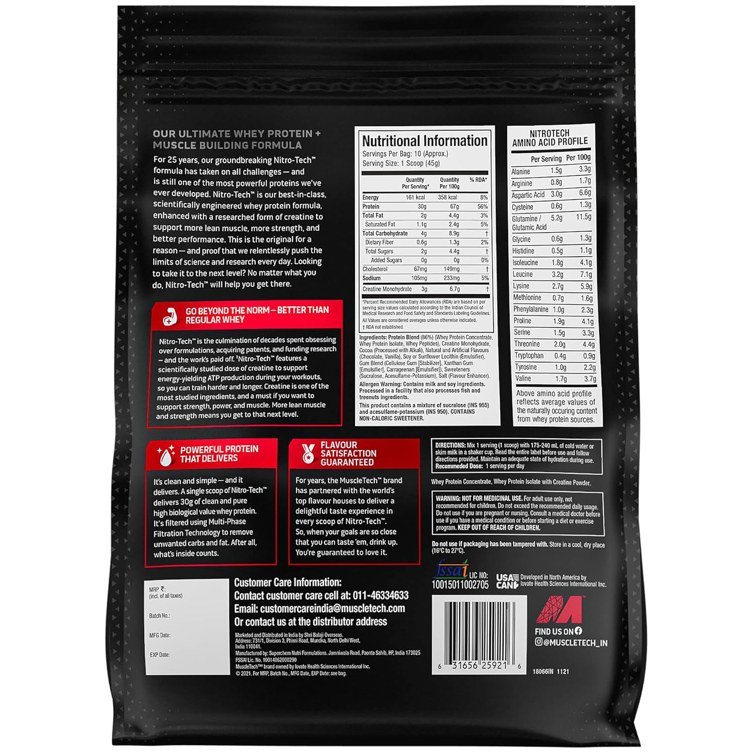 Nitro-Tech® is a scientifically engineered, enhanced whey protein formula designed for all athletes who are looking for more muscle, more strength and better performance. Nitro-Tech® contains protein sourced primarily from whey protein isolate and whey peptides – two of the cleanest and purest protein sources available. Other whey protein supplements might have only a few grams of these highly bioavailable and easily digested proteins. Nitro-Tech® is also enhanced with the most studied form of creatine for even better gains in muscle and strength.