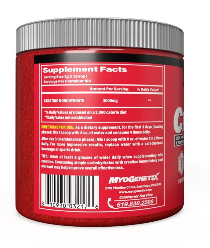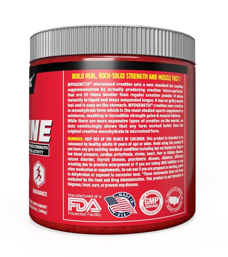 MYOGENETIX® micronized creatine sets a new standard for creatine supplementation by actually producing creatine ‘micro-particles’ that are 20 times smaller than regular creatine powder. It mixes instantly in liquid and stays suspended longer. It has no gritty mouth feel and is easy on the stomach. MYOGENETIX® creatine uses creatine in monohydrate form which is the most studied sports supplement in existence, resulting in incredible strength gains & muscle fullness. While there are more expensive types of creatine on the market, no data convincingly shows that any form worked better than the original creatine monohydrate in micronized form.