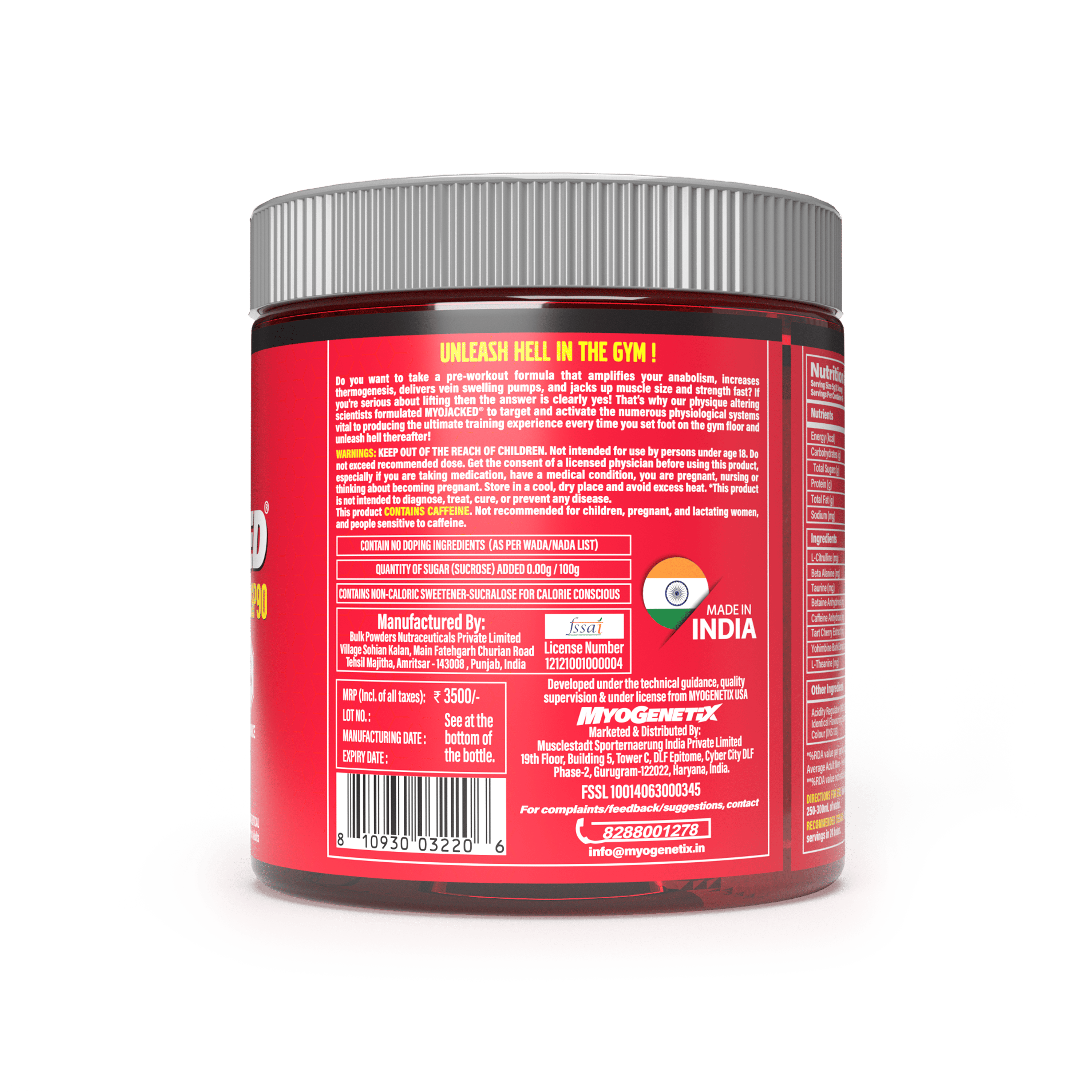 Myogenetix Myojacked Pre-workout Powder helps amplify anabolism, increases thermogenesis, delivers vein swelling pumps, and jacks up muscle size and strength fast. Myogenetix Myojacked Pre-workout Powder is formulated to target and activate the numerous physiological systems vital to producing the ultimate training experience every time you set foot on the gym floor and unleash hell thereafter.