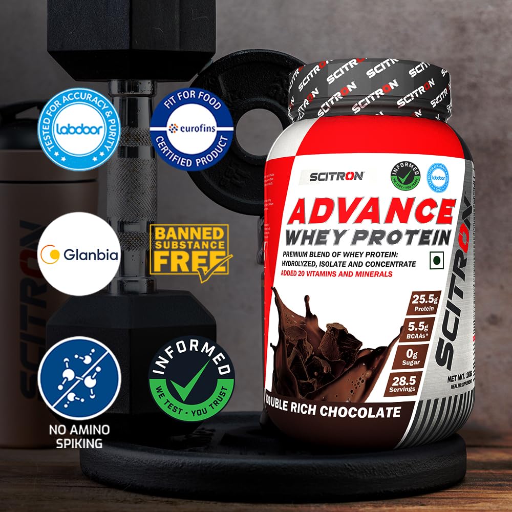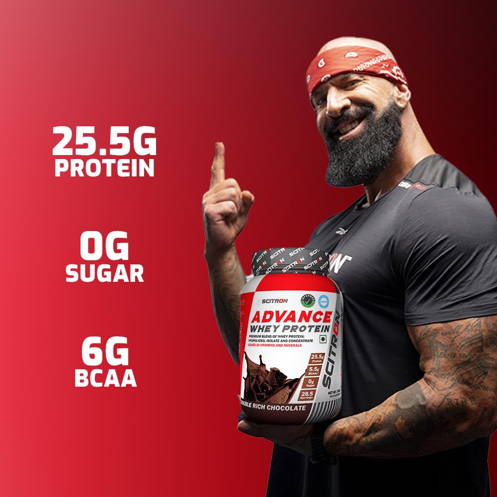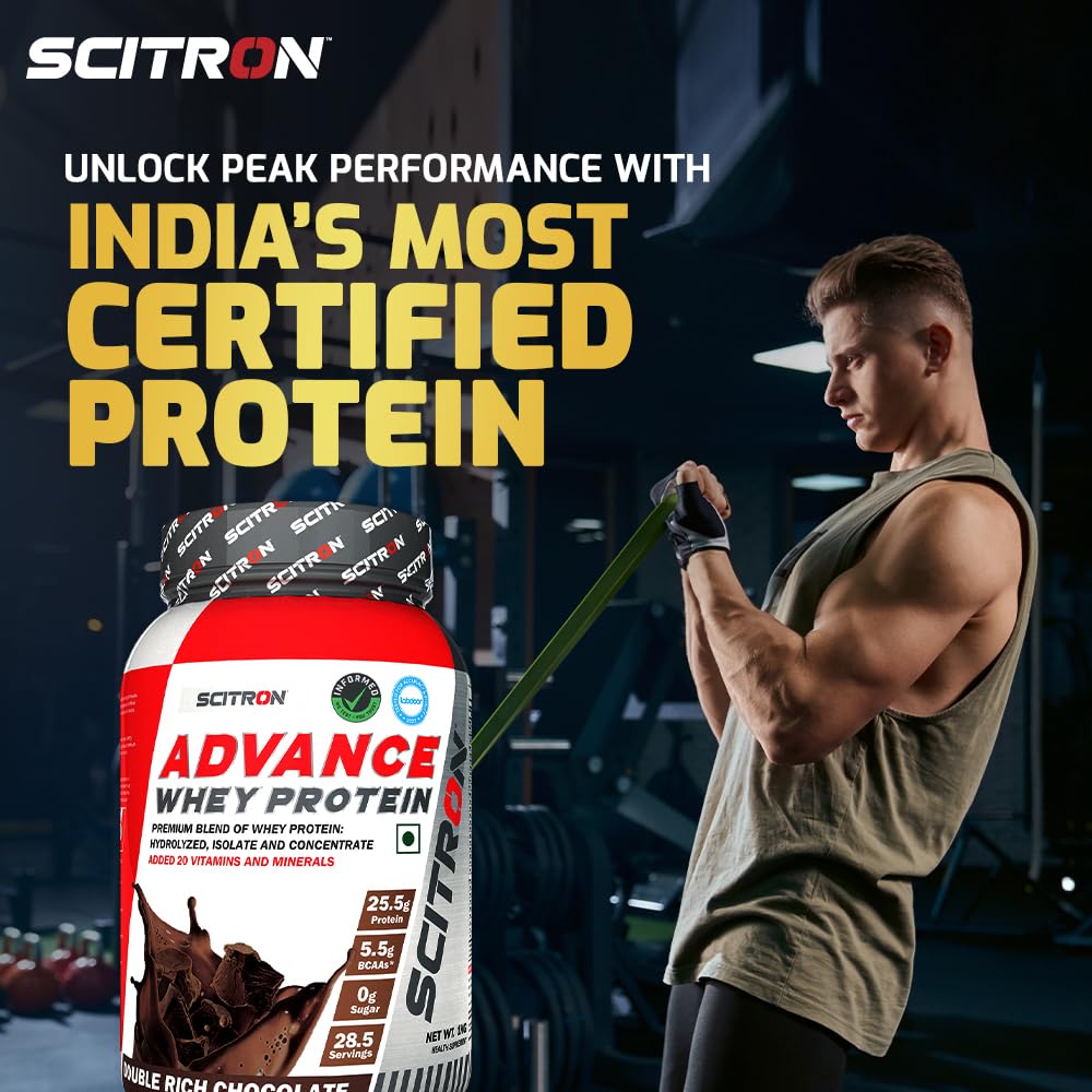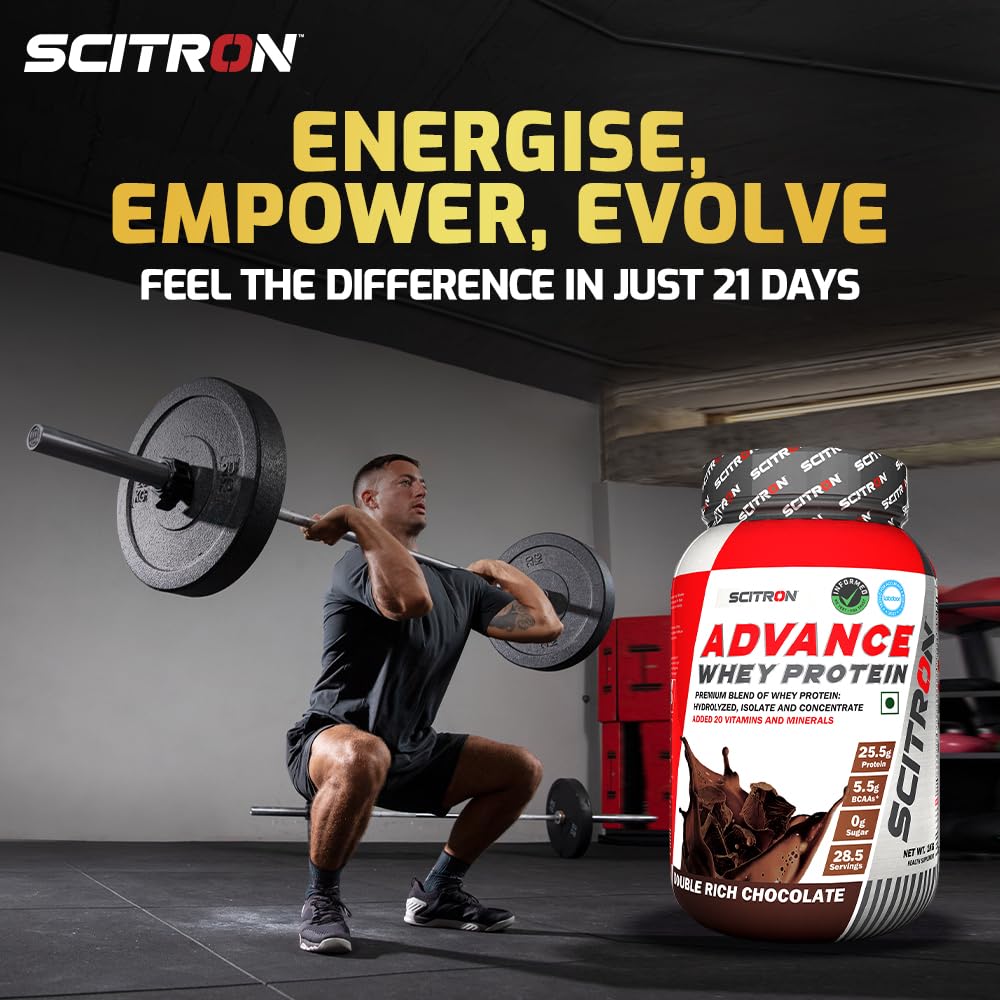 Scitron's essential whey protein features whey protein isolate as the main ingredient, combined with micro-filtered whey protein concentrate, providing 24g of protein per serving.