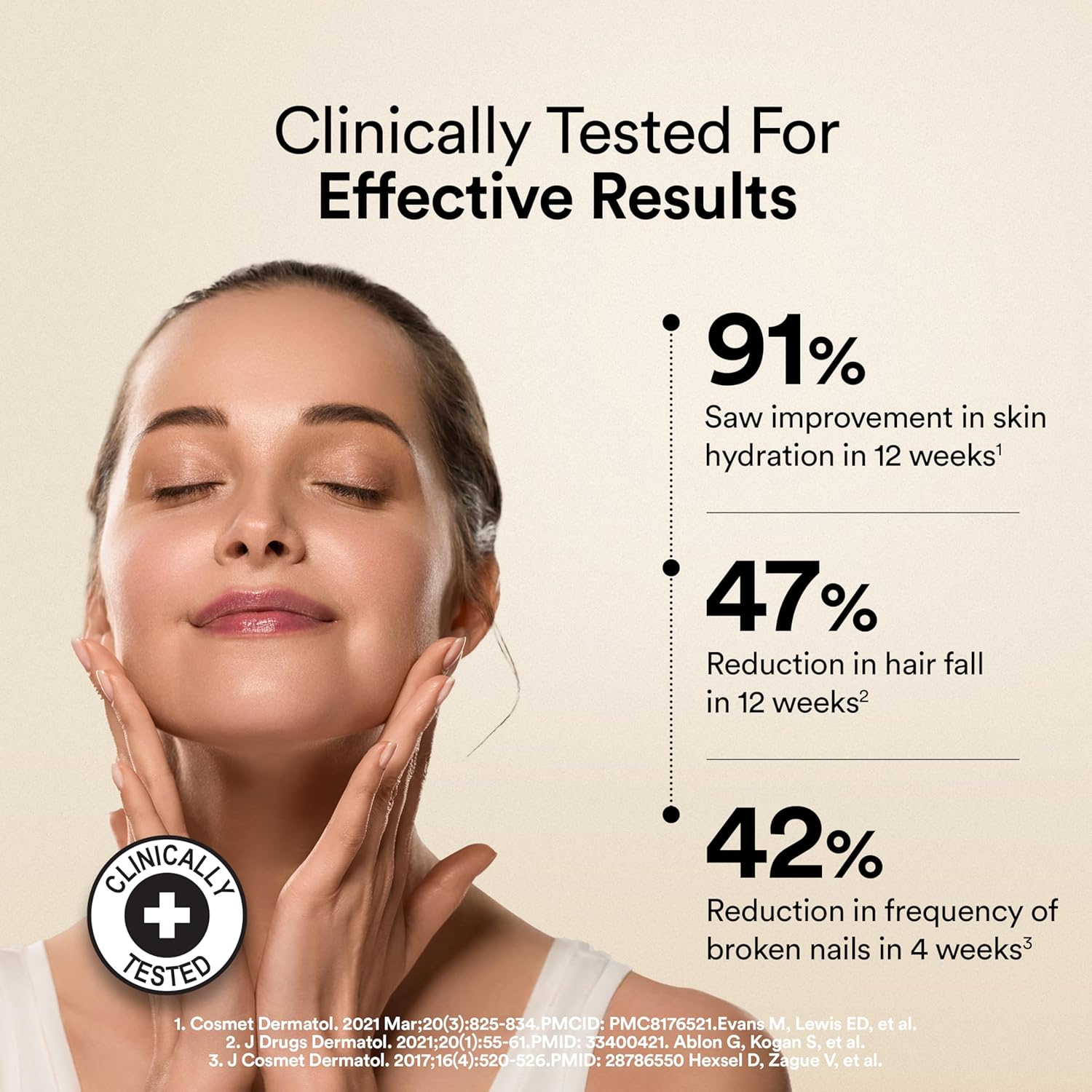 A dermatologist recommended a proprietary formulation of 8000 mg Premium Marine Collagen (Type I & III) combined with clinically proven botanicals, potent antioxidants & added ingredients such as Hyaluronic Acid, Rosehip, Astaxanthin, Natural Biotin, Vitamin C from Acerola Cherry & Vitamin E, in precise doses.